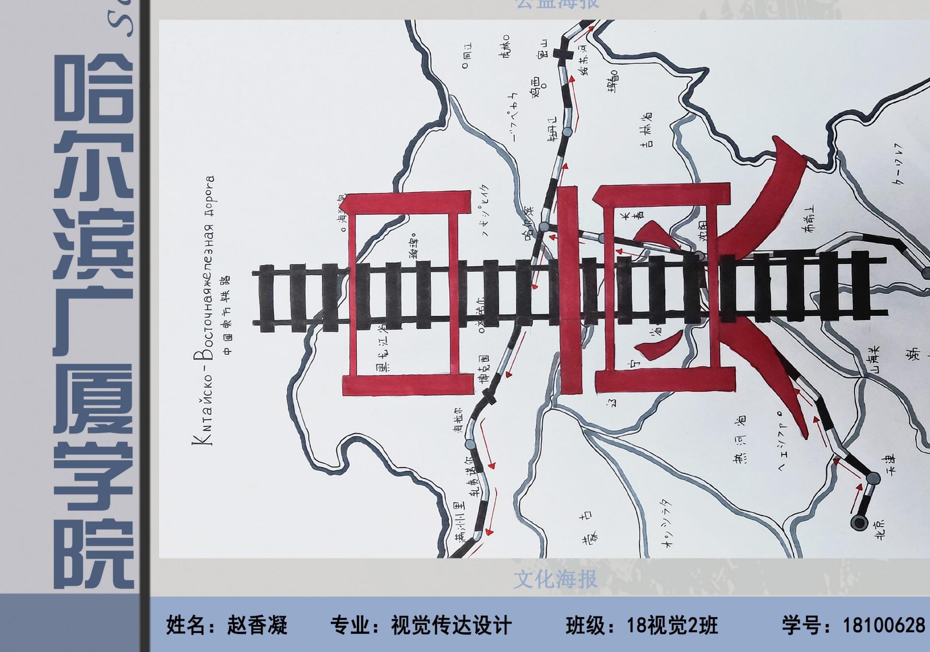 铁轨展现了中东铁路的文化,贯穿整个画面的黑色铁轨喻意中东铁路带给这片土地的交流。画面通过文字设计融合铁路沿线,展现中国红色革命的发展历程。