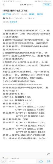 在线上教学工作中,全校学生学习通班级群迅速建立。为了更好地将学生的学习情况和家长沟通,我建立了微信群,课前把下周要学习的材料发送到里面,让学生提前预习与熟悉课程,也为了学生们能够课后复习。并且把课程的具体各项要求发送到里面。