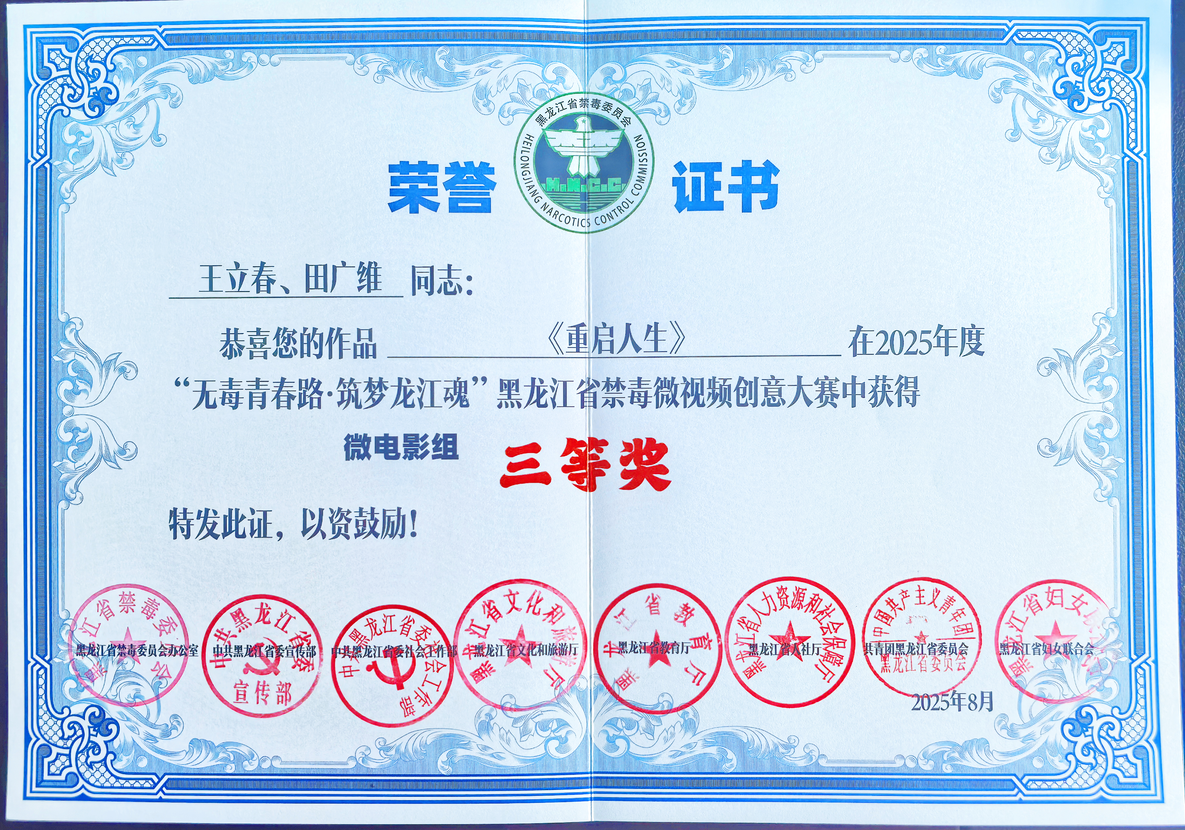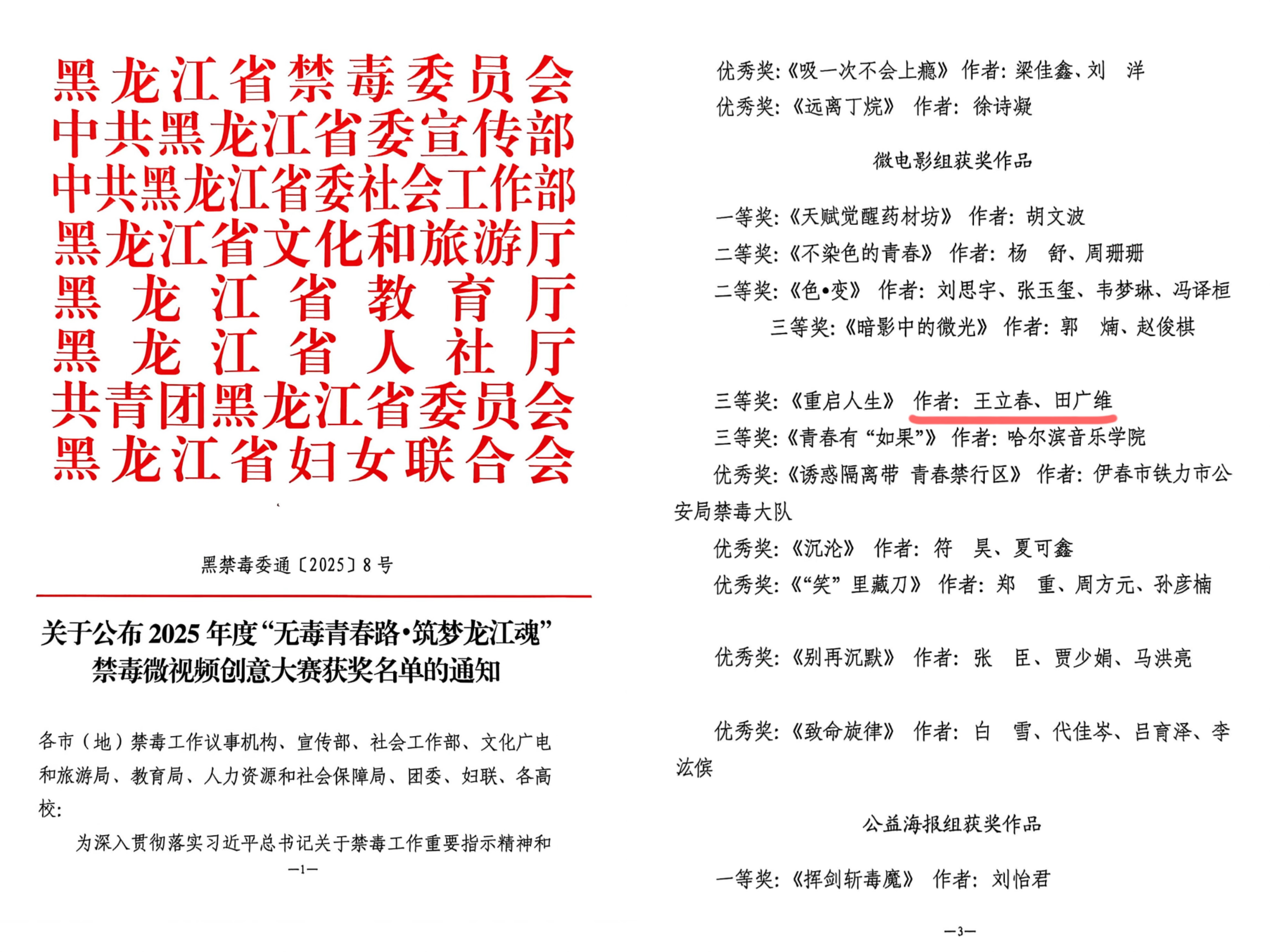 近日,2025年度“无毒青春路·筑梦龙江魂”黑龙江省禁毒微视频创意大赛圆满落幕。我校参赛作品《重启人生》在新视域文化产业学院的培育下脱颖而出,荣获微电影类三等奖,展现了我校师生在禁毒宣传领域的卓越才华与坚定决心。