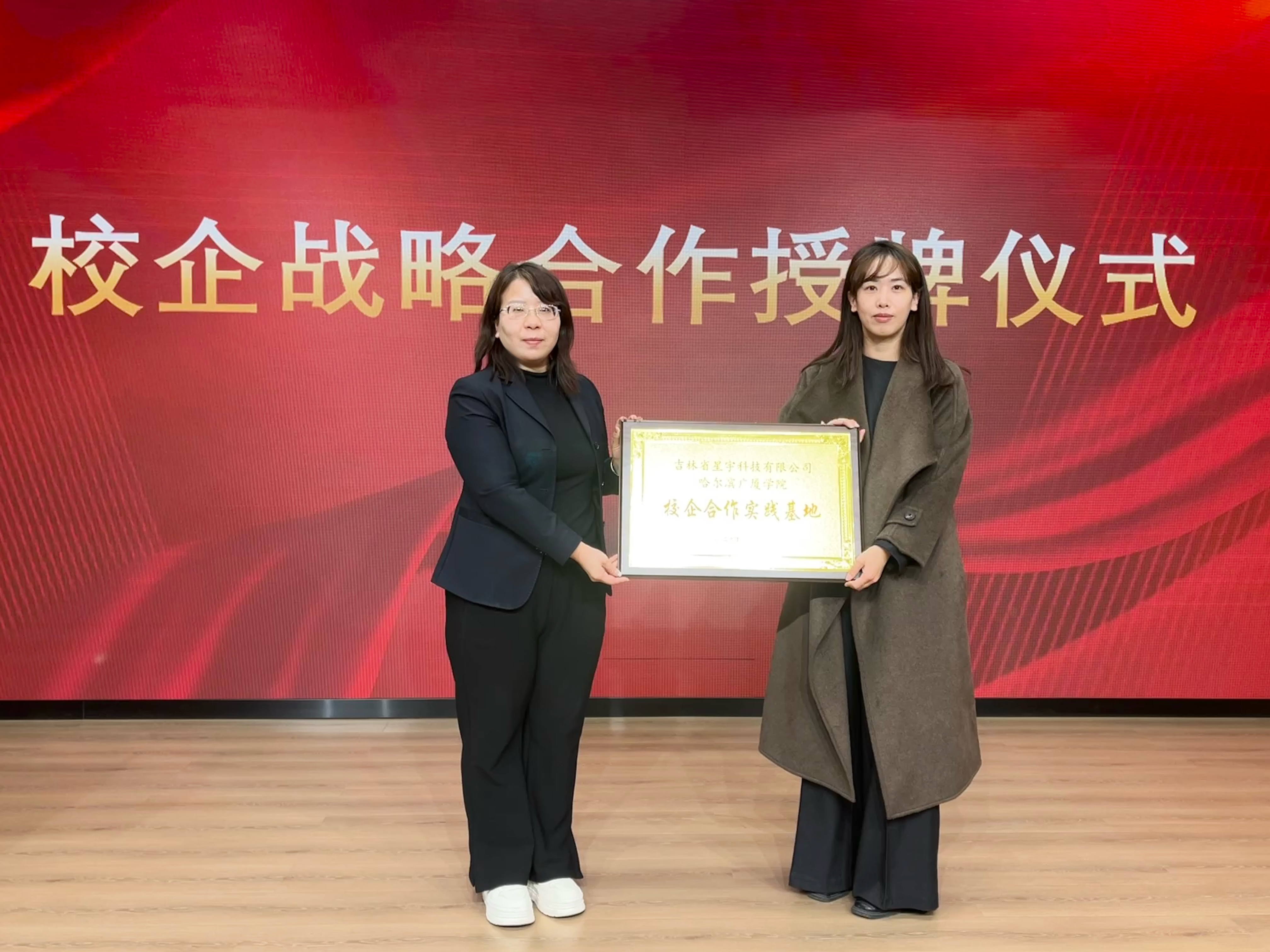 在现场师生见证下,哈尔滨广厦学院人文教育学院院长王莫楠与吉林省星宇科技有限公司董事长潘星,分别代表校企双方郑重签署了合作协议。随后,人文教工党支部副书记王晓亭与吉林省星宇科技有限公司总经理王宇共同完成了实习基地的授牌。
