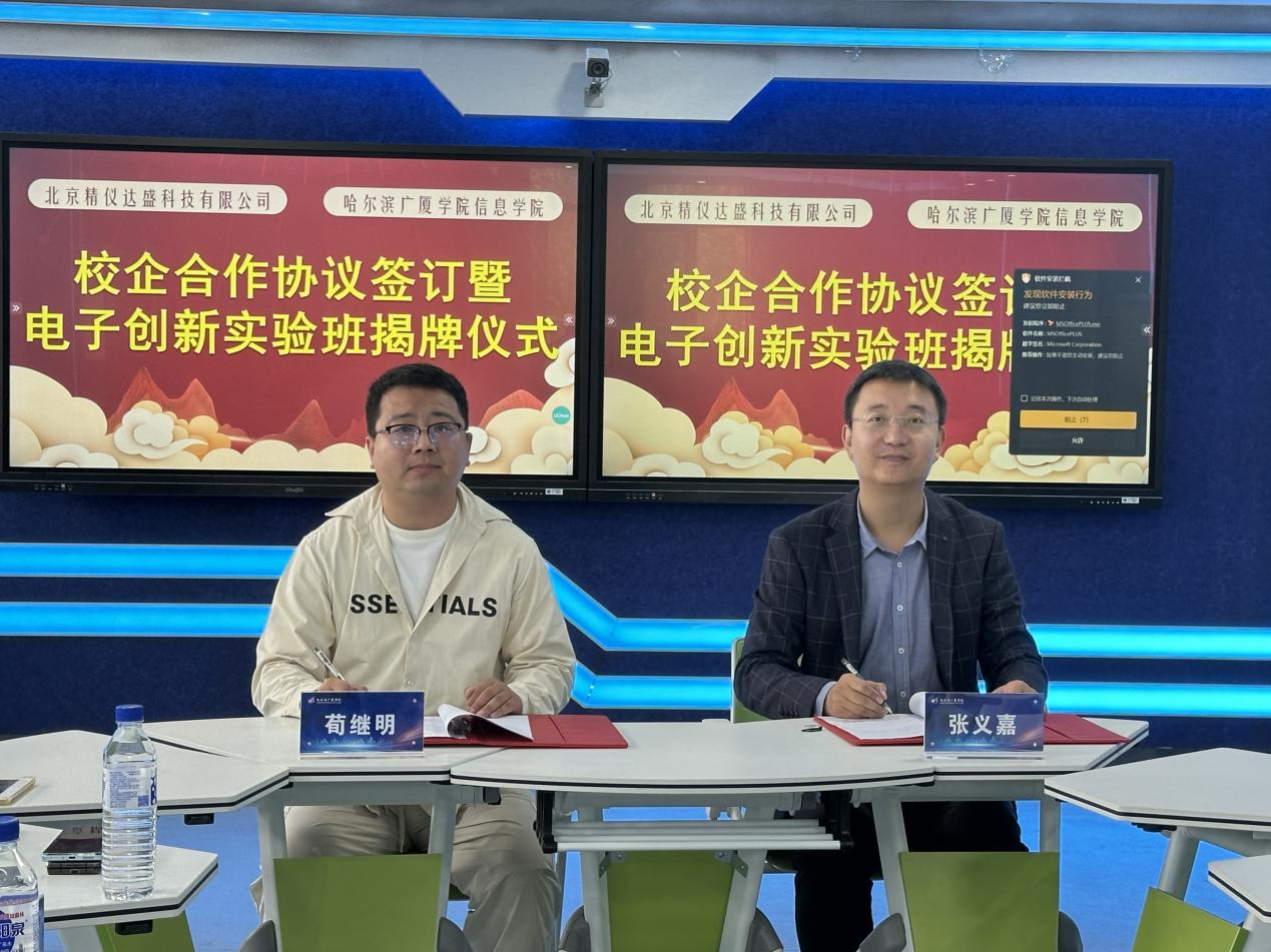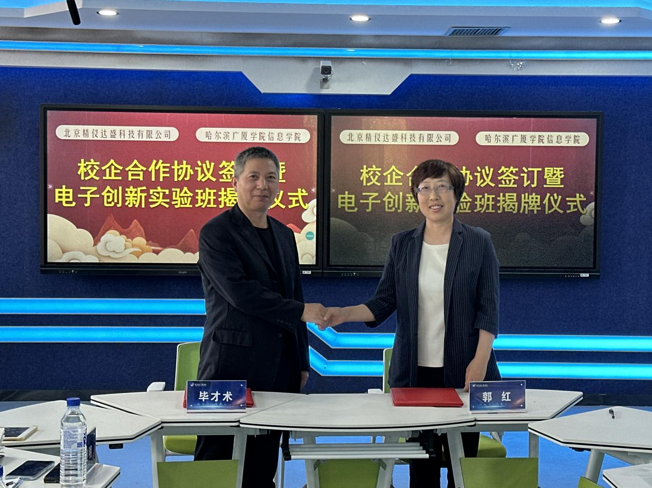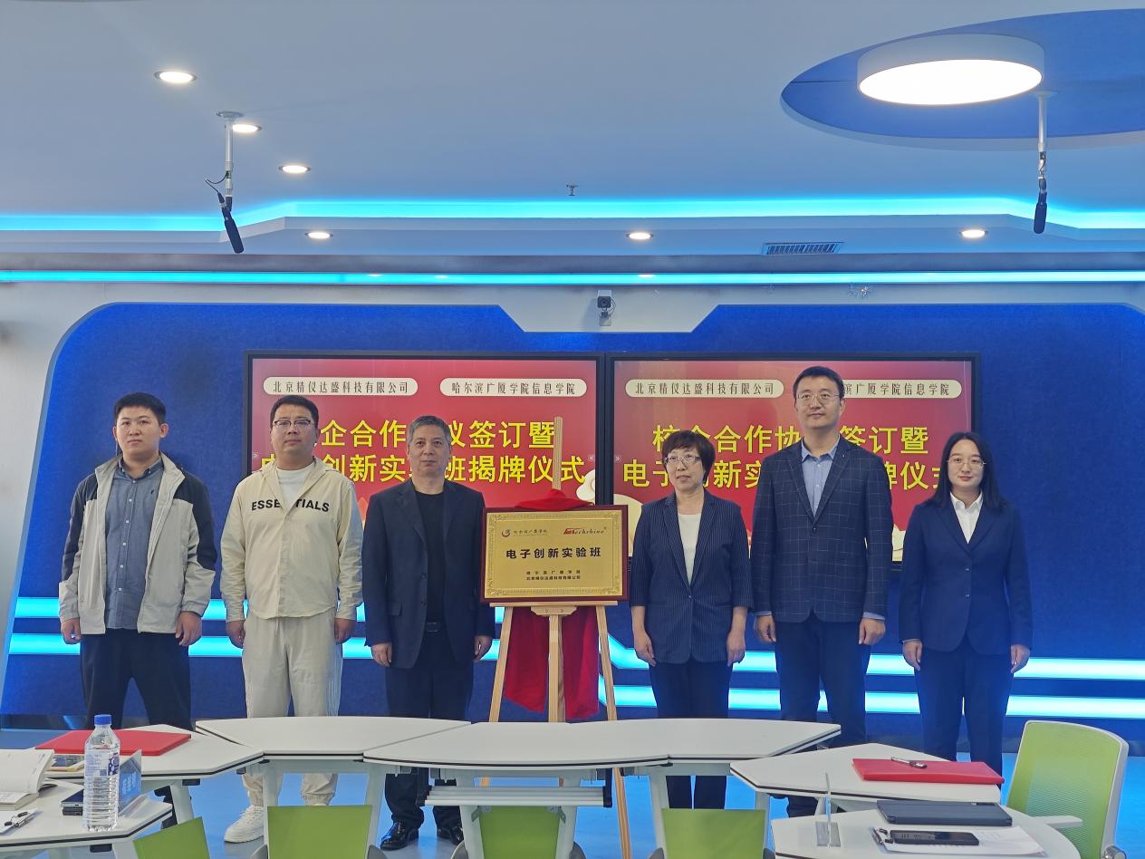 9月26日,哈尔滨广厦学院信息学院(新E代数智未来产业学院)与北京精仪达盛科技有限公司在主楼智慧教室举行电子创新实验班揭牌仪式。双方现场签署《校企合作协议》及《电子创新实验班校内实习基地协议》,旨在深化产教融合,构建“产学研用”协同育人新模式,推动电子信息领域创新型人才培养。
