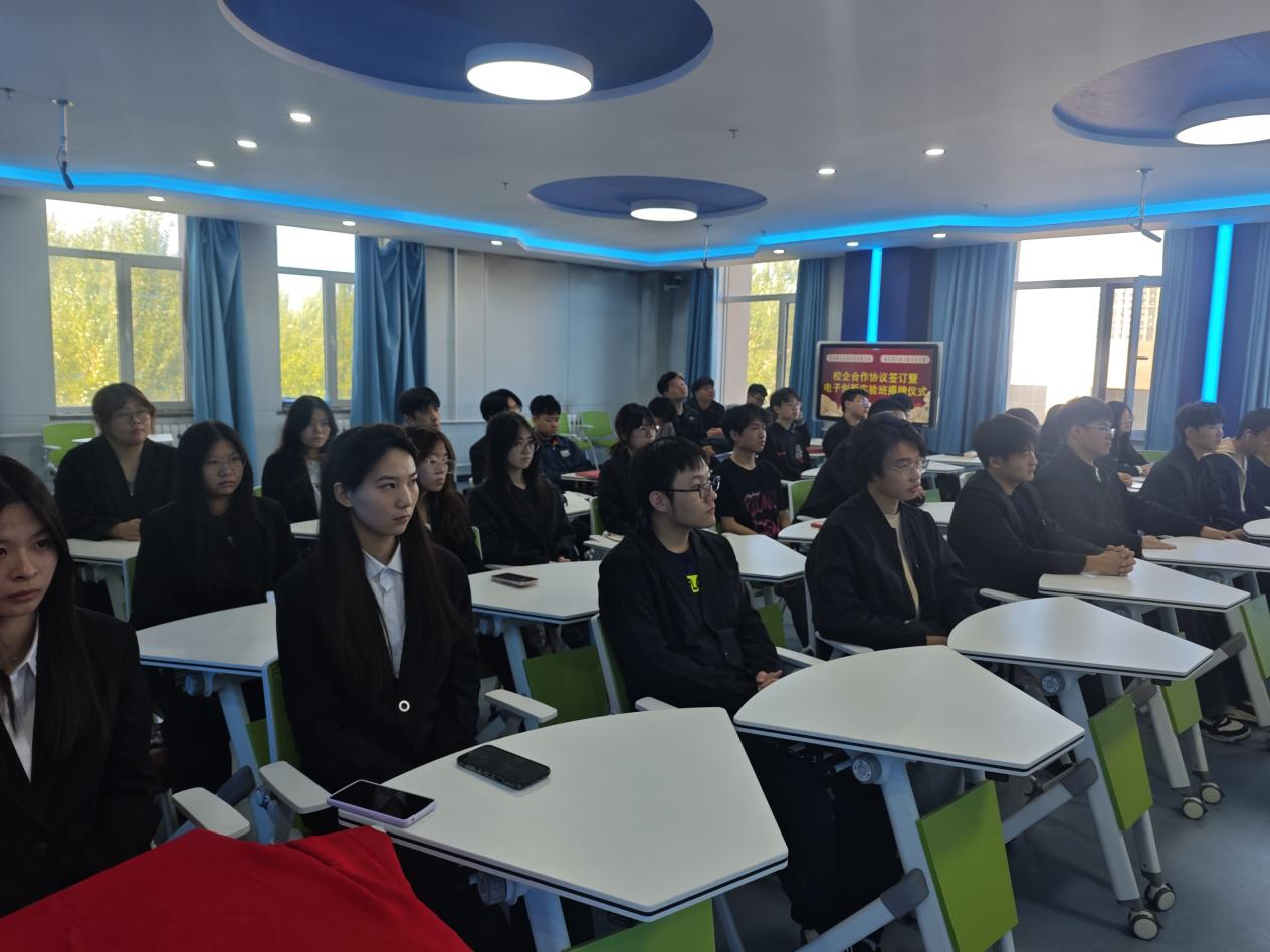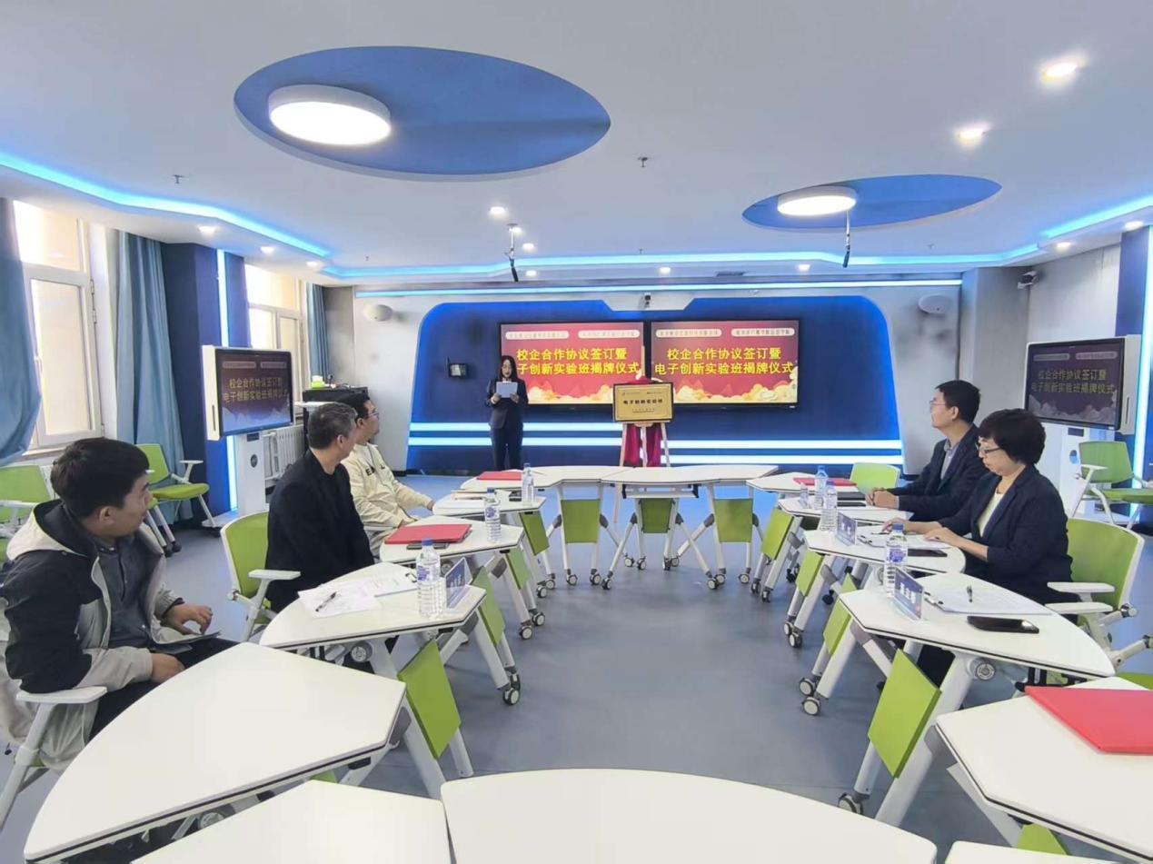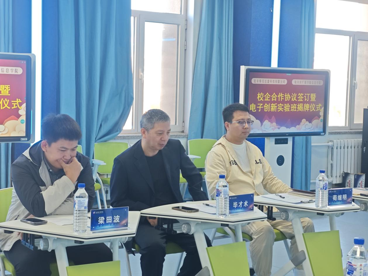 9月26日,哈尔滨广厦学院信息学院(新E代数智未来产业学院)与北京精仪达盛科技有限公司在主楼智慧教室举行电子创新实验班揭牌仪式。双方现场签署《校企合作协议》及《电子创新实验班校内实习基地协议》,旨在深化产教融合,构建“产学研用”协同育人新模式,推动电子信息领域创新型人才培养。