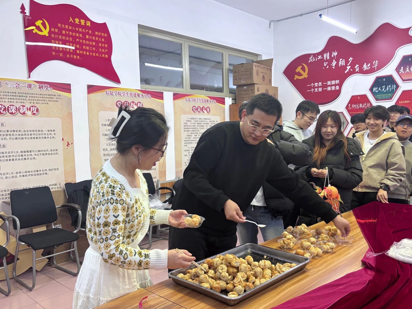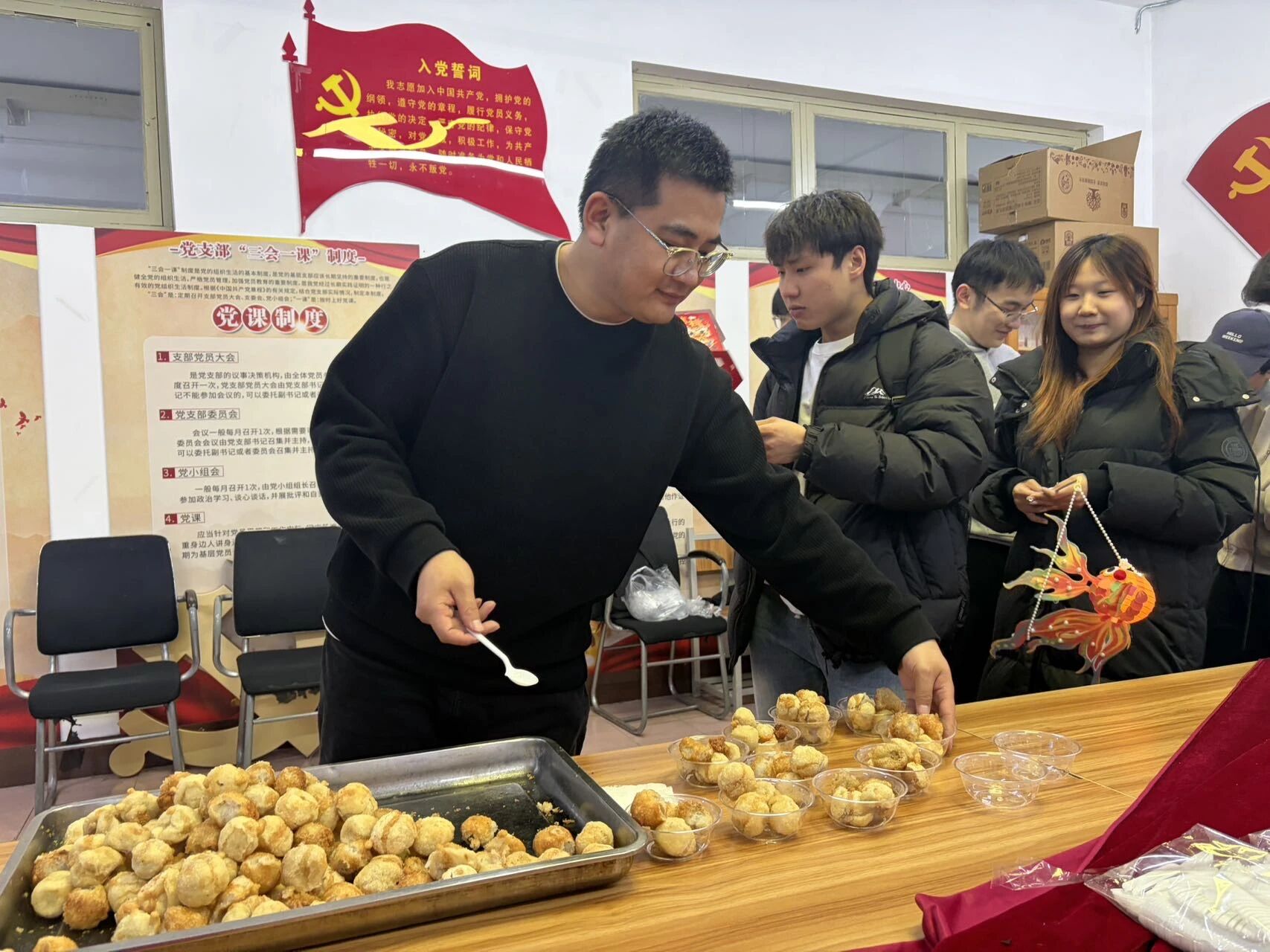 活动伊始,老师们将一盘盘金黄酥脆的炸汤圆亲手送到每位同学手中。外酥里糯的炸汤圆裹着香甜的馅料,冒着诱人的热气,一口下去,酥脆的外皮在齿间轻响,内里的甜润馅料瞬间迸发,不仅是舌尖上的双重美味,更藏着团圆美满的美好寓意,让每一位同学都在校园里感受到如家一般的温暖与安心。