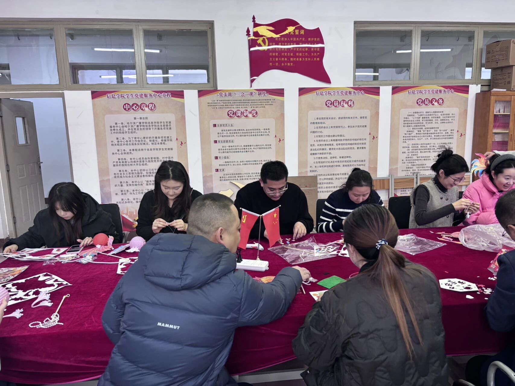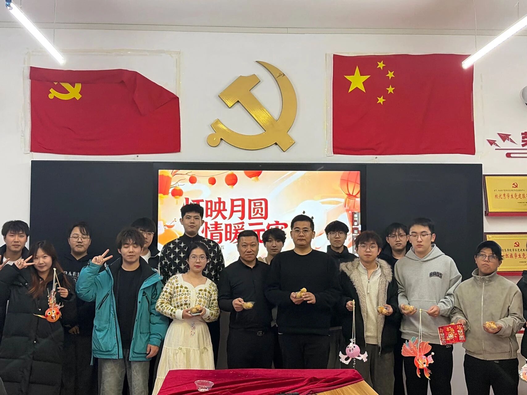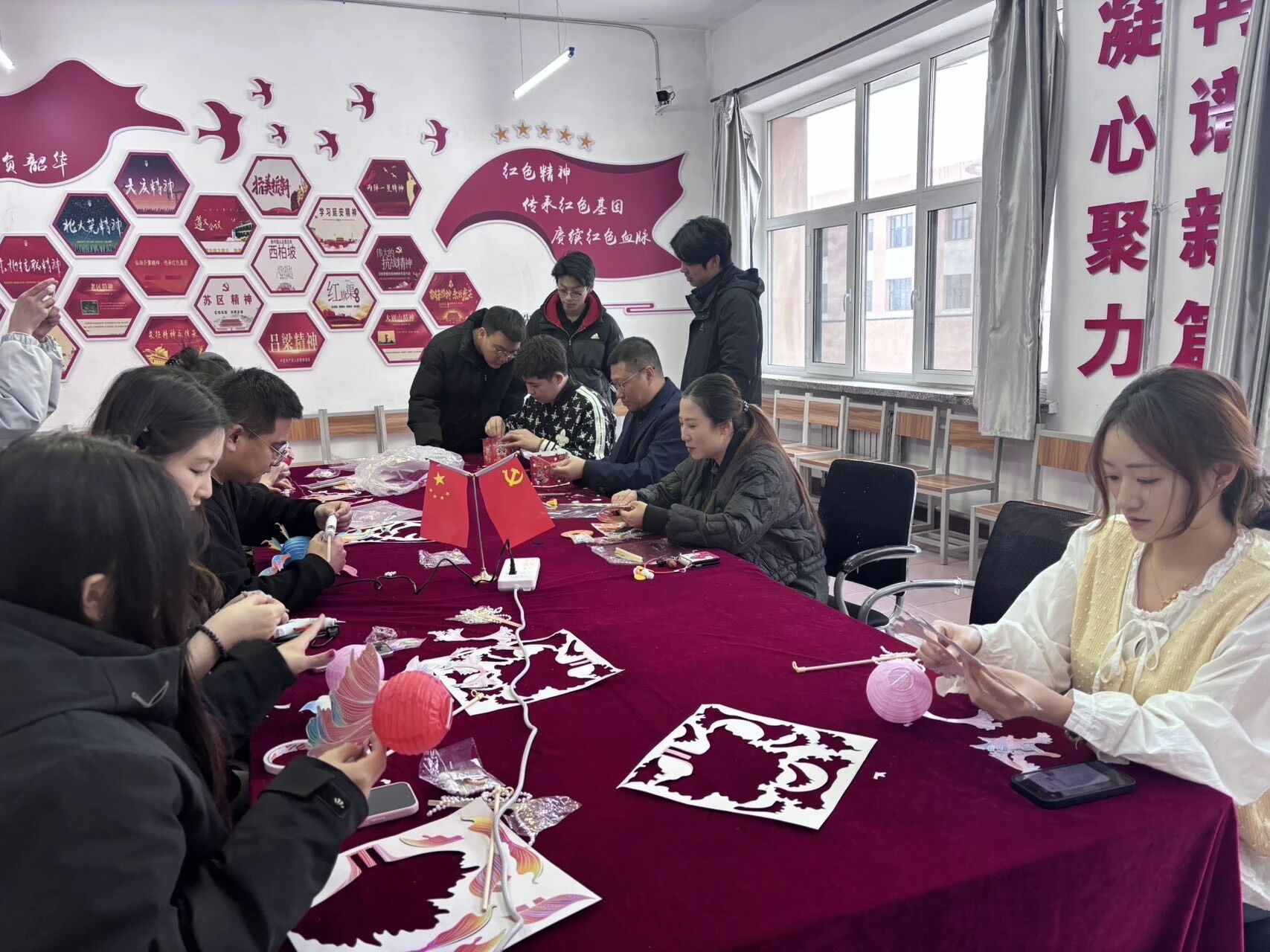香甜未尽,创意登场。在温馨的氛围中,大家分组协作,开启了趣味满满的元宵灯制作环节。同学们老师们围坐在一起,剪彩纸、搭灯架、绘图案、系流苏,分工合作、默契配合,指尖流转着匠心与欢喜。一盏盏精致可爱的小灯在欢声笑语中慢慢成型,点亮的不仅是传统民俗,更是青春的心意与团圆的美好。