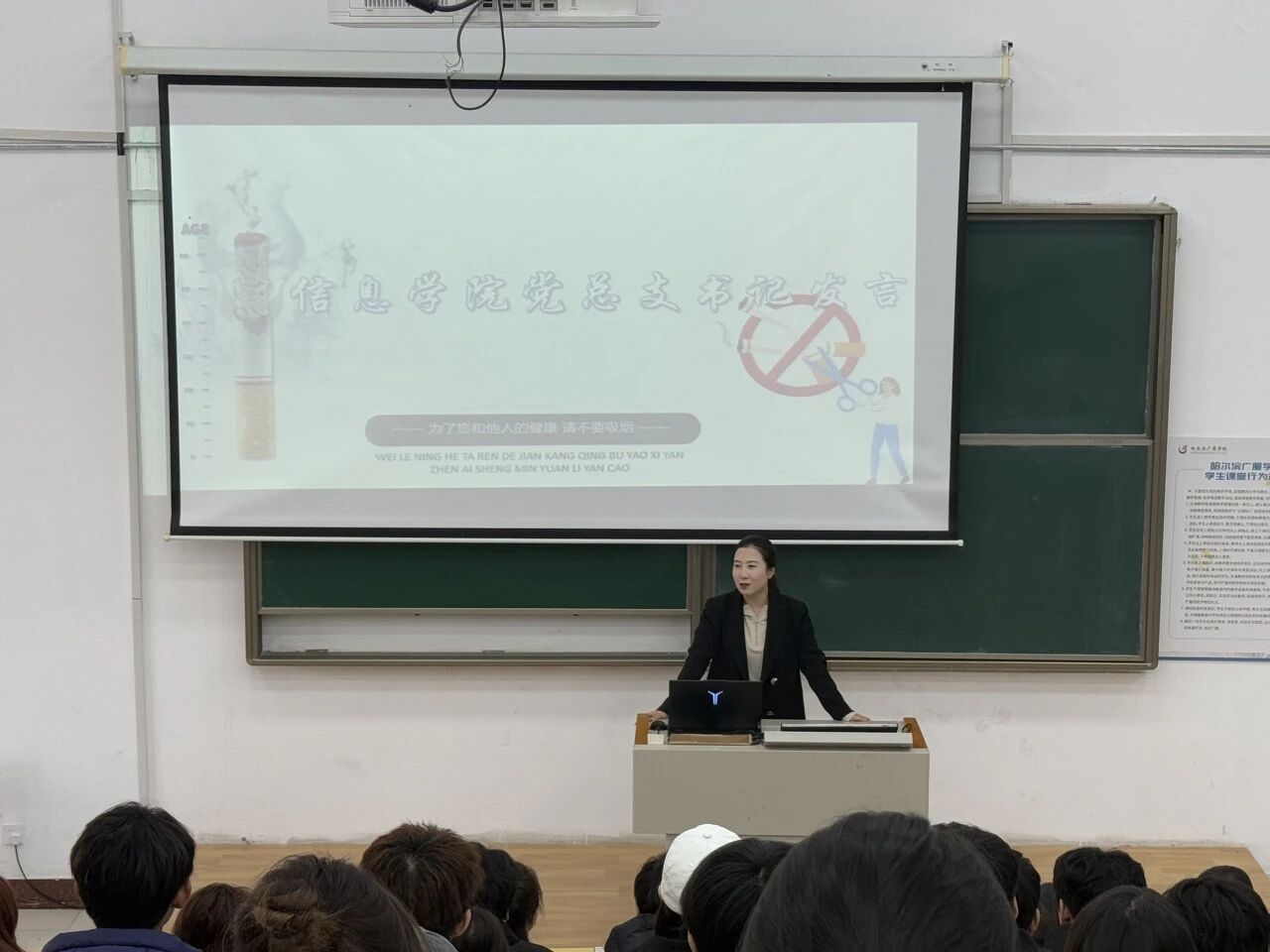 信息学院党总支书记王宁娟,发表动员讲话。书记从校园安全、文明建设与学生健康三个维度,对禁烟控烟专项行动进行全面部署。她强调,禁烟工作不仅是管理要求,更是育人责任,希望全体同学提高自律意识,共建清朗校园。