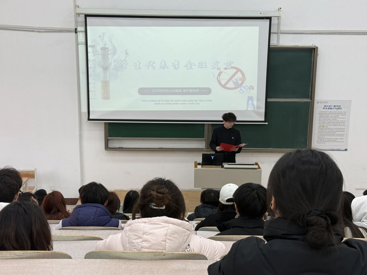 学生代表李金旺上台发言。他结合同学们的日常学习生活实际,向全院师生发出郑重倡议,呼吁大家从自身做起,严格遵守禁烟规定,争做无烟校园的倡导者与守护者,用实际行动维护清新和谐的校园环境。
