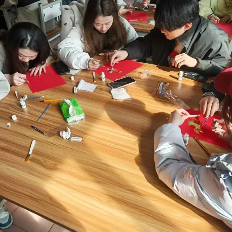 活动现场,同学们全神贯注投入其中,小心翼翼地将轻薄如蝉翼的金箔铺展、按压、粘贴,指尖轻捻间尽显专注。大家结合自身创意,搭配颜料勾勒轮廓、点缀细节,将建筑美学、花草纹样、爱国元素等融入创作,有的以简约线条搭配金箔凸显大气质感,有的用色彩与金箔交织营造灵动氛围,还有的融入专属设计打造个性作品。