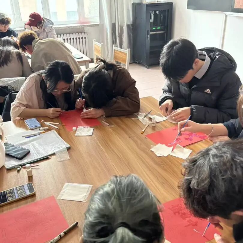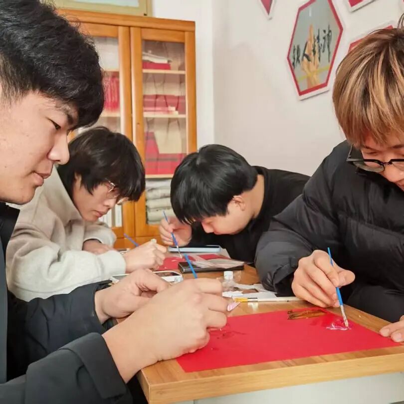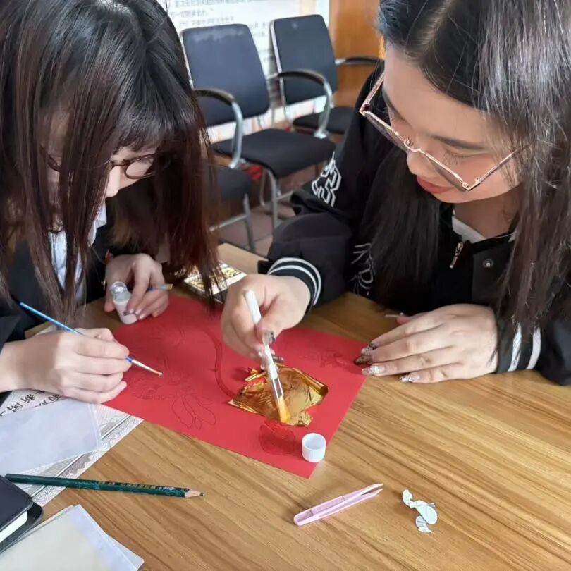 创作过程中,同学们围坐交流,不时分享贴金箔防皱、服帖粘贴的实用技巧,遇到构图、配色难题便相互出谋划策,现场氛围轻松热烈。同学们全神贯注,指尖轻捏薄如蝉翼的金箔,小心翼翼铺展、按压、调整位置,搭配颜料细致勾勒轮廓、点缀装饰,结合自身创意,搭配颜料勾勒轮廓、点缀细节,将建筑线条、花卉纹样、简约图案等创意融入画面,每一笔、每一片金箔都倾注专注。