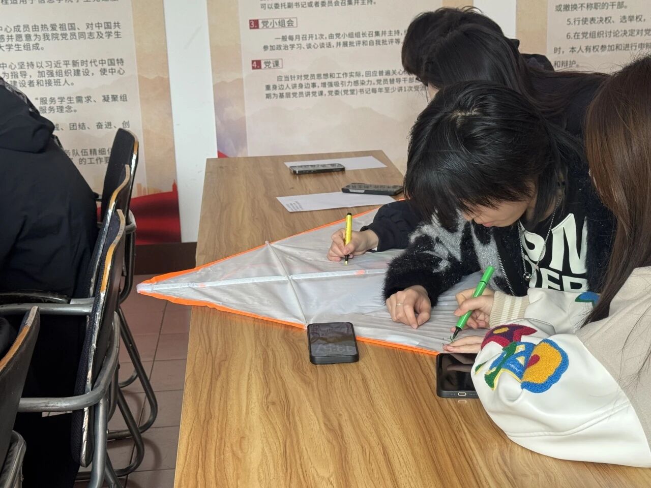 涂色风筝创作环节中,同学们用彩色画笔绘制专属风筝,通过色彩表达内心情绪,并在风筝上写下自我鼓励的话语,将创意融入指尖艺术。
