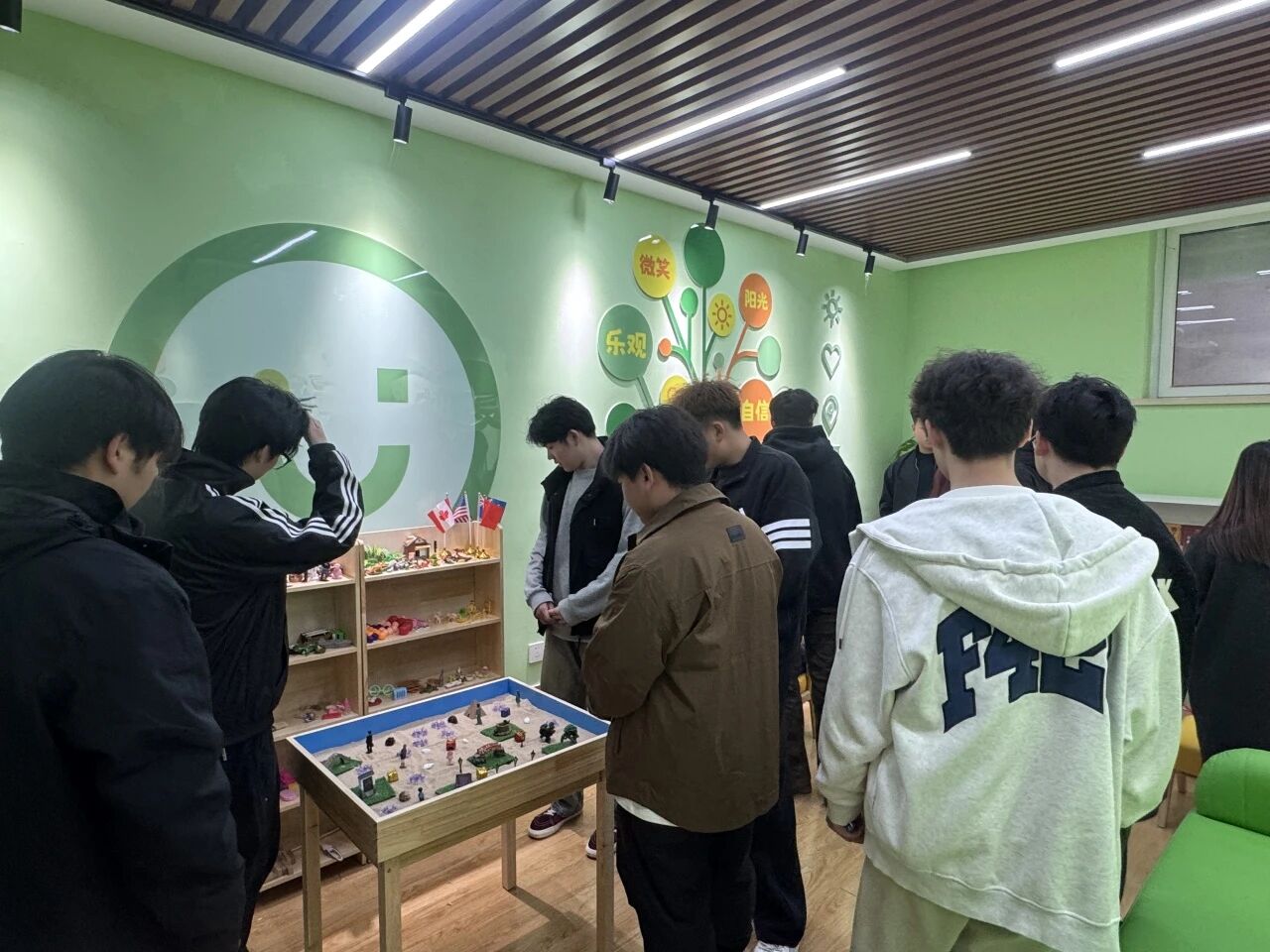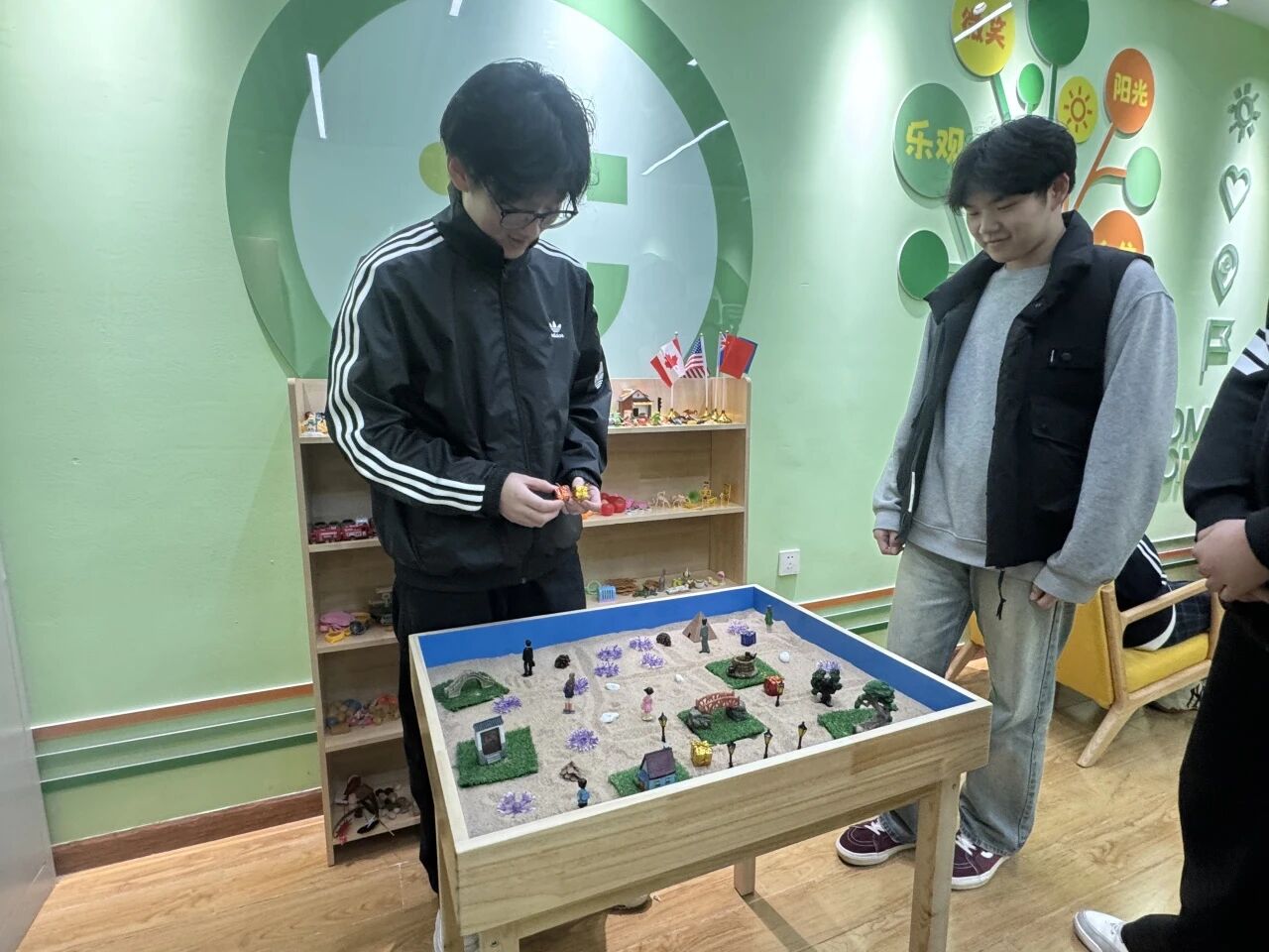 活动尾声,大家移步至一站式社区学生心理活动室,参与“心灵沙盘”互动。在专业老师的引导下,同学们通过沙盘构建表达情绪、探索内心,梳理潜在困惑,情绪在指尖与细沙的触碰中舒缓,收获了专业疏导与心灵慰藉。