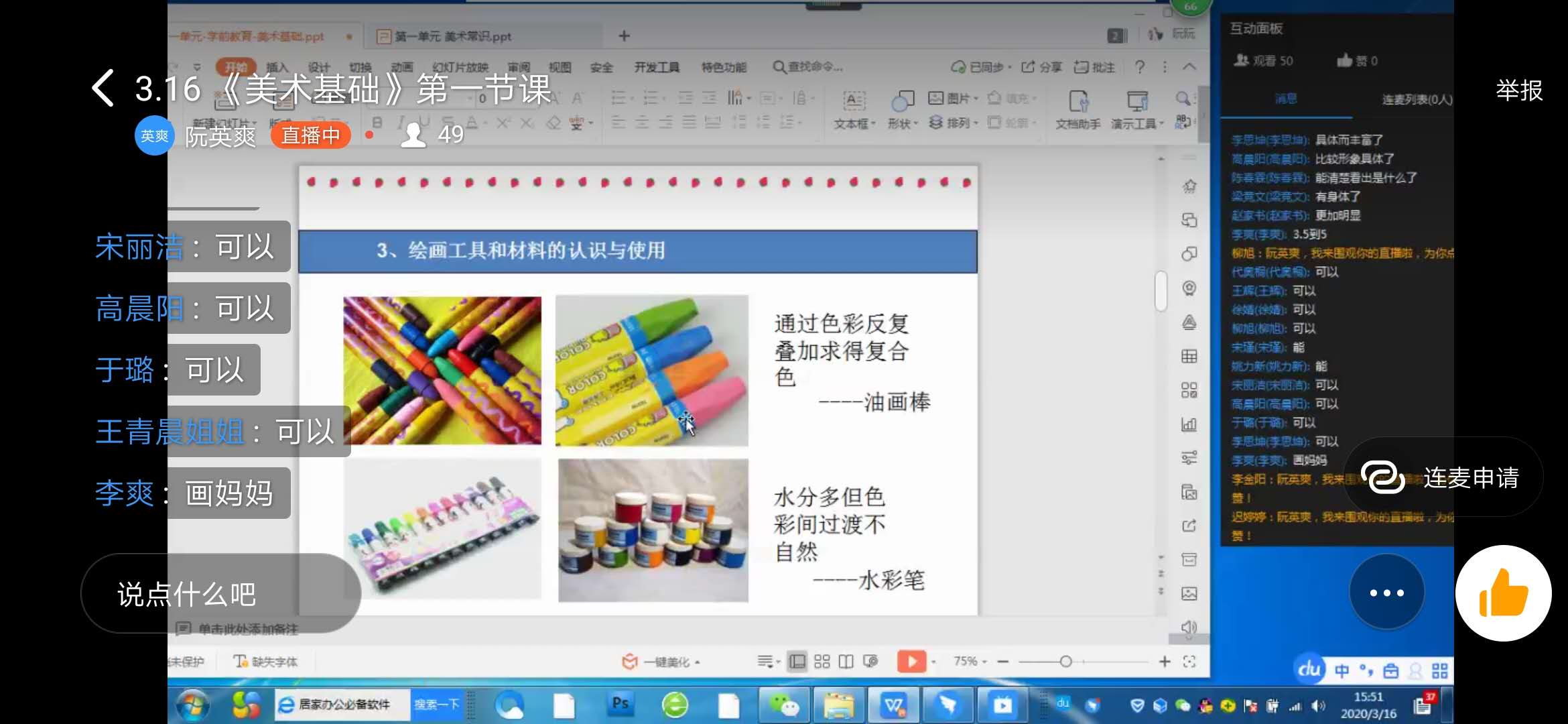 在艺术与传媒学院稳步的网络专业课程及特色艺术类公共课程开展中,教师们均能熟练的运用线上教学平台和软件进行授课,为完成线上教学工作做好充分的准备。在艺术设计中,不分时段的多平台有针对性答疑辅导也提升了学生对设计生活艺术的学习感知热情。艺术与传媒学院组织学生成立线上班级群,下载教学软件,充分的专业课程及拓展学习不断稳步的开展课程,全体师生的通力合作为抗击疫情,努力奋斗,不断学习,建设国家,贡献力量!