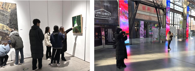 实训当天,美术馆内随处可见哈尔滨广厦学院学子的身影。他们背着相机穿梭于红砖厂房与展厅之间,时而蹲伏在钢铁管道旁,聚焦锈迹斑斑的纹理与光影的交织;时而驻足于色彩浓烈的艺术装置前,尝试用构图平衡工业的厚重与艺术的灵动;时而与美术馆工作人员、参观者交流,挖掘场景背后的历史故事与人文温度。