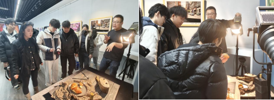 参观落幕之际,博物馆特邀摄影专家带来纪实摄影创作专题讲座,专家结合黑龙江本土案例,深入浅出讲解纪实作品的历史文献性、社会推动力与人文关怀内核,强调 “镜头既要捕捉时代变迁,更要传递人间温度”,互动环节学生围绕 “数字时代如何保持纪实摄影的真实性” 等问题热烈讨论,专家的精彩解答厘清了创作思路;讲座后,汇丰影像的老师们迅速搭建好两个专业商业摄影静物台,搭配各类质感拍摄道具与调试到位的灯光设备,一旁还陈列了多款搭载前沿功能的新型相机产品,老师们细致讲解操作要点、构图逻辑与光线运用技巧,手把手指导同学们调试参数、调整角度,鼓励大家尝试不同镜头语言,同学们分组上阵沉浸式拍摄,在理论与实践的碰撞中感受摄影魅力。