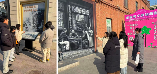 在一幅还原老哈尔滨商埠生活场景的壁画前,成为构成课实践的首个观察点。老师手指壁画讲解:“大家看,画面里人物的姿态是‘点’的组合,窗框的格栅形成‘线’的秩序,整个墙面作为‘面’承载场景,这种‘点线面’的布局,就是构成设计里的画面组织逻辑。”学生们纷纷举起相机,有的聚焦人物动态捕捉“点”的形态,有的拍摄窗框线条分析“线”的走向,还有的从整体角度观察“面”上元素的分布,笔记本上很快记录下对壁画构成元素的拆解思考。