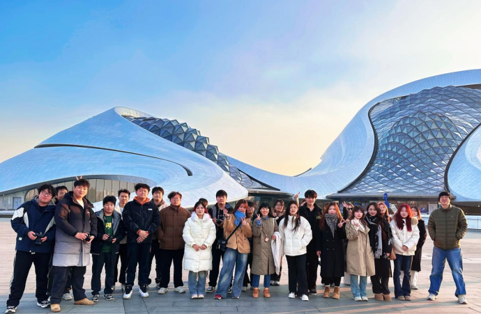 除了纪实摄影创作,本次活动还融入了建筑美学传播的实践环节。学生们在拍摄过程中,同步录制了多段“建筑解说短视频”,用通俗的语言讲解大剧院的设计巧思,例如“曲面幕墙如何实现声学与美学的双重优化”“内部曲线空间如何营造沉浸式观演体验”等。这些短视频将在哈尔滨广厦学院官方平台、学生自媒体账号上发布,以“影像 + 科普”的形式,让更多人尤其是艺术爱好者与建筑迷,通过生动的画面与易懂的讲解,走进哈尔滨大剧院的艺术世界,感受建筑与光影的对话魅力。