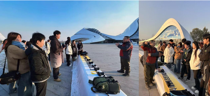 随后,哈尔滨广厦学院艺术与传媒学院影视摄影与制作专业带队教师结合建筑场景,现场讲解纪实摄影的核心要义:“大剧院摄影不仅要‘拍好看’,更要‘讲好建筑故事’。要从曲线的韵律里捕捉建筑灵魂,从光影的变幻中挖掘空间情绪,让每一张照片都成为建筑与观者的对话媒介。”