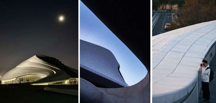 在内部空间区域,有人将镜头对准盘旋而上的曲线楼梯,以低角度拍摄强化空间的延伸感与韵律感;有人则细致拍摄剧场内部的曲面穹顶、座椅排列,以微观视角展现建筑的精密设计与人文温度。更有学生别出心裁,以“时间线”为叙事逻辑,从清晨的大剧院到夜晚的灯光秀,用镜头串联起建筑在一天中的形态变迁,展现“曲线与光影”的动态对话。