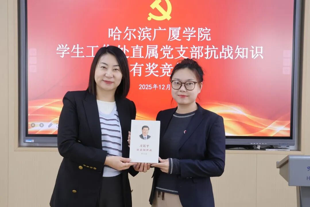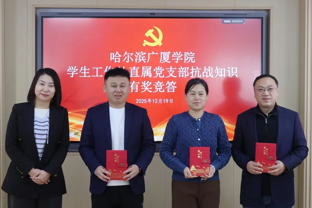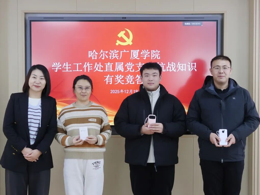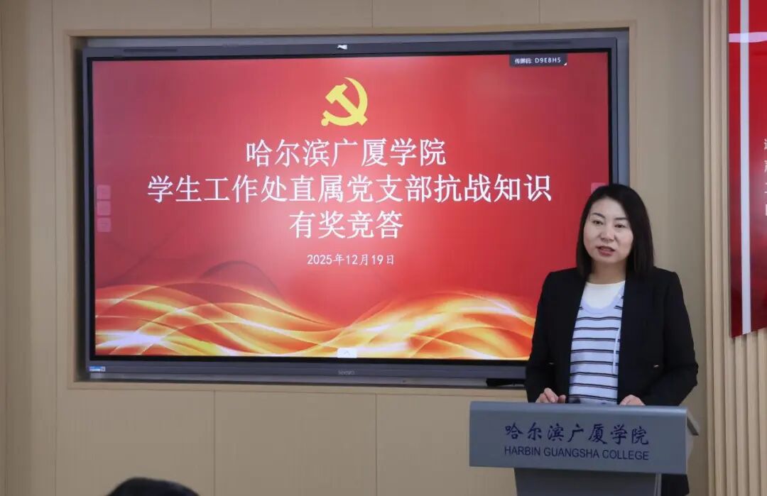 为铭记中国人民抗日战争的光辉历史,传承和弘扬伟大抗战精神,12月19日,学工直属党支部在“思e”一站式学生社区成功开展抗日知识有奖问答活动。哈尔滨广厦学院学生工作处直属支部委员会书记孙婷、全体党员以及积极分子参加活动。活动以趣味答题的形式搭建历史学习平台,营造出“以赛促学、以学促行”的浓厚红色学习氛围。