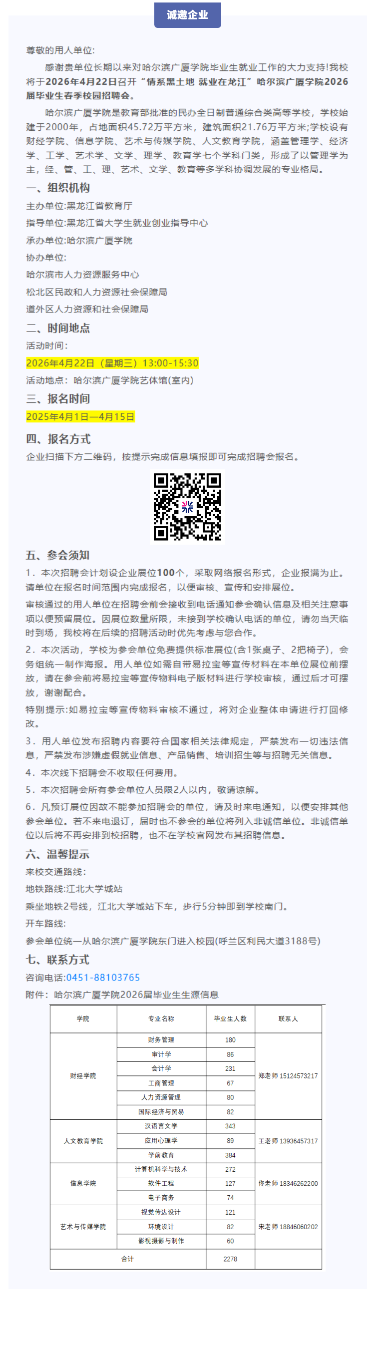 【哈尔滨广厦学院】“情系黑土地 就业在龙江”哈尔滨广厦学院2026届毕业生春季校园招聘会邀请函