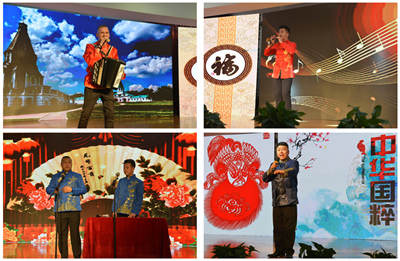 由教职工合唱队带来的合唱《我和我的祖国》、《贝加尔湖畔》拉开了联欢会的序幕。字正腔圆、劲健婉转的新编历史京剧《曹操》演绎了气冲云霄的豪迈与横亘时空的深情;节奏欢快、开阔悠扬的唢呐独奏《好日子》表达了广厦人对幸福生活的热爱和对美好未来的憧憬;外籍教师伊尔法特带来了精彩的乐器表演,欢快的旋律让现场观众在中西文化的交融中如痴如醉;相声表演《一定要幸福》幽默诙谐、妙趣横生,让现场观众捧腹大笑。