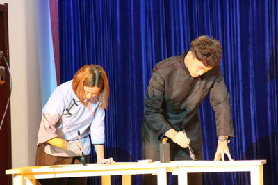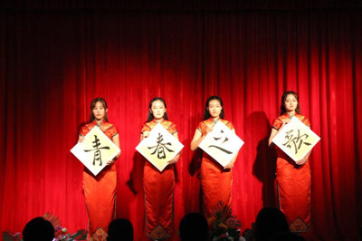 渐进尾声,通识教育学院还为本次大赛选送了三个节目,其中独具特色的民族舞《鸿雁》更是引来了软笔书法爱好者的雅兴,现场泼墨,为本次大赛题词“青春之歌”四字,充分展现了汉语言文学专业学生较扎实的专业技能。在全场的一片呼声中,通识教育学院“青春之歌”口才大赛圆满落幕。