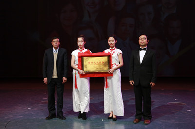 演出正式开始前广厦学院校长叶曲炜和北美之星艺术团团长刘振宇分共同为我校国际交流协会授牌。