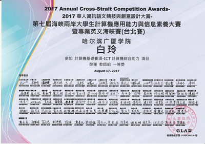 8月22日,“第七届海峡两岸大学生计算机应用能力与信息素养大赛与专业英文海峡赛(台北赛)”在台湾台北市“国立台湾师范大学”圆满结束。信息学院白玲老师与信息学院2016级计算机科学与技术专业赵桐同学,代表哈尔滨广厦学院第一次参加海峡两岸国际赛事。师生共同参与比赛,经过与两岸选手的激烈角逐,共获得七项大奖。