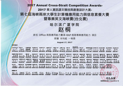 其中,赵桐同学获得“OFFICE商务应用能力赛项-BAP商务专业应用能力项目”本科组一等奖和“计算机基础赛项-ICT计算机综合能力项目”本科组二等奖;白玲老师获得“OFFICE商务应用能力赛项-BAP商务专业应用能力项目”教师组一等奖和“计算机基础赛项-ICT计算机综合能力项目”教师组三等奖,共4项参赛大奖;同时,白玲老师获得优秀指导教师奖2项;师生为哈尔滨广厦学院荣获海峡两岸教育交流贡献奖1项。