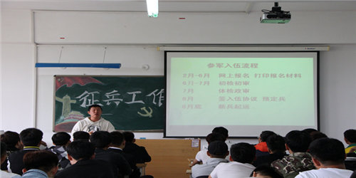 刘宝山老师为大家详细讲解了征兵的具体内容,对应征的对象、文化条件等做了详细的解说,简要的概括了2017年秋季征兵的注意事项,还强调了所有应征入伍的大学生都能享受国家的政策优待、经济优待、学业优待和就业优待。