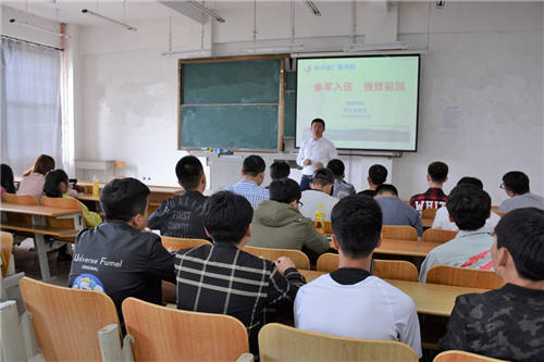 为响应国家推进国防和军队现代化建设的征兵工作号召,积极落实有关征兵会议的精神,激发我校适龄大学生参军热情,提高兵员征集质量,鼓励大学生积极参与应征入伍,5月15日管理学院在第三教学楼西阶一教室开展了一场以“参军入伍,报效祖国”为主题的征兵宣讲会,宣讲会由招生就业处刘宝山老师主持。