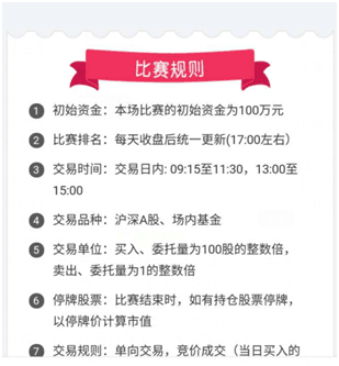 本次模拟炒股大赛活动时间为2017年4月20日-5月20,比赛采用先进的证券网上交易系统优顾炒股系统,进行真实交易所环境的模拟交易,向每个参赛账号提供虚拟资金100万进行模拟投资买卖,比赛成绩以5月20日收盘后的总资产排名为准,排名指标为每个交易日收市后帐户股票总市值加资金余额即总资金市值。最后一个交易日收市后的总资金排名为本次比赛最终排名。比赛中未做任何操作的选手不参加最终排名。