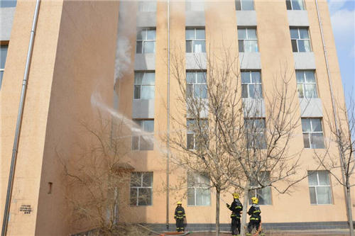为检验师生在楼宇内发生火灾后的疏散逃生能力,演习场景设计为公寓内起火,现场浓烟翻滚。学校迅速启动应急救援疏散预案,公寓管理人员迅速拨打火警电话119,学校相关部门领导及消防官兵迅速赶到火场处置“险情”,学校广播播放疏散逃生要领,稳定师生情绪,民兵连工作人员到楼内熟练地引导师生紧急疏散、撤离到安全地点,并清点人数。