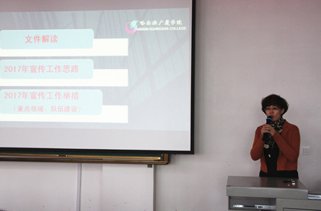学院办公室主任戴宏从宣传队伍组建、宣传工作流程、新闻报道制度、宣传品的印制与管理、宣传信息员的工作职责等方面对学校宣传工作实施办法进行了详细解读,提出了学校2017年度宣传工作总体思路和重点任务。