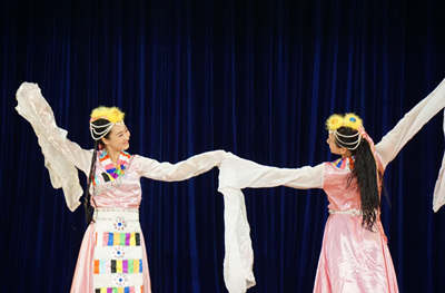 五位校级领导带来了配乐诗朗诵《2016,我们难忘》,在轻柔的音乐声中,校领导们声情并茂、抑扬顿挫的朗诵带领全体教职工共同回顾了满载收获的2016年,让广厦人的每一分耕耘、每一份收获深深回荡在脑海里、定格在记忆中。轻歌漫漫、衣袂飘飘,婀娜的身姿、轻盈的舞步,两位美丽的舞者深情演绎了藏族舞《卓玛》,诠释了大草原宽广豪迈的情怀。