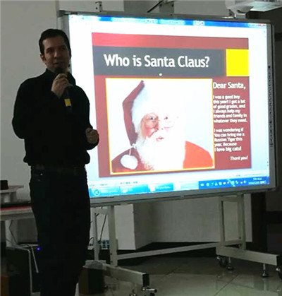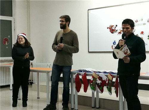 外籍友人加入了现场抽奖环节,从同学们精心准备的圣诞贺卡中选读圣诞祝福,并为幸运学生送出精美礼品。