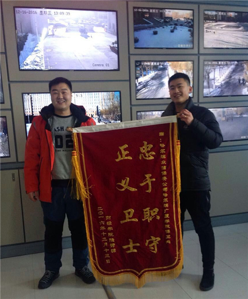 12月16日,我校财经学院2014级陆同学将一面写有“忠于职守,正义卫士”的锦旗送到了学校后勤保卫处,感谢后勤保卫处帮助他找到了丢失的自行车。