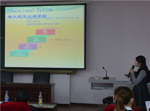 管理学院获得澳大利亚双硕士学位的海归教师李佩俞讲述了自己在澳大利亚学习期间的切身体会。李佩俞老师用幽默风趣的语言和形象生动的短片展示了澳大利亚大学的学制、多彩的留学生活、优美的自然风光以及中西课堂、中西文化的差异,为全体与会人员带来了一次视觉上的海外之旅。
