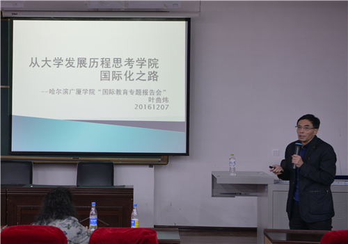校长叶曲炜作了题为《从大学发展历程思考学院国际化之路》的专题报告。叶校长围绕什么是国际化、为什么要推行国际化、如何实现国际化等问题,引经据典、谈古论今、深入浅出地进行了讲述。叶校长以现代大学的产生作为起点,详述了大学与人类文明进步之间的密切联系,强调了大学在培养人文情怀和倡导学术自由方面的重要作用,并对通才教育和专才教育两种不同的教育模式进行了对比分析。叶校长强调指出大学的国际化关键在于人的国际化,而人的国际化则要通过人的价值观念、精神态度、思想意识、思维方式等各个方面的跨文化、跨地域转化来实现。
