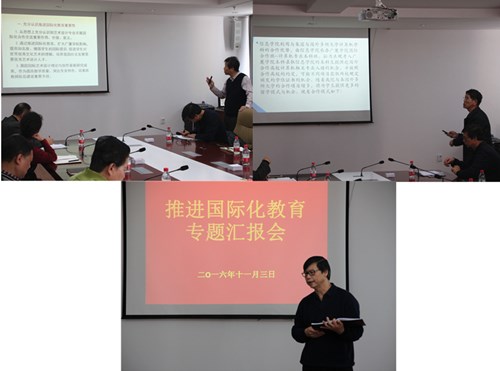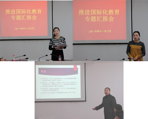 11月3日上午9时,在主楼第一会议室召开了推进国际化教育专题汇报会,校长叶曲炜,常务副校长朱定强,副校长韩毓洁,党委副书记、督导专员金连芳及全体中层干部出席了会议,会议由国际交流与合作中心主任高建国主持。