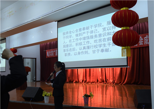 随后,新一届校学生会成员代表李怡萱宣读《学生干部管理条例细则》,并由校团委办公室主任张豆豆带领全体学生干部宣誓。
