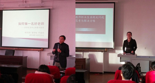 10月26日下午,学校在第三教学楼报告厅召开了2016-2017学年第一学期全体教师培训会暨教师职业生涯规划专题讲座,校长叶曲炜,副校长韩毓洁,党委副书记、督导专员金连芳及哈尔滨师范大学教师教育学院副院长林红教授出席了会议。