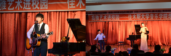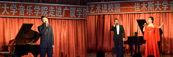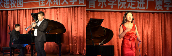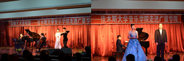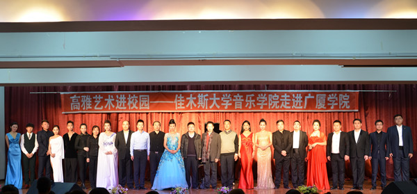 10月18日下午17时30分,在图书馆五楼报告厅成功举办了“高雅艺术进校园——佳木斯大学音乐学院走进广厦学院”文艺晚会。来自佳木斯大学音乐学院的艺术家们融高雅与流行音乐为一体,为我校师生带来了一场别开生面的视听盛宴。我校常务副校长朱定强,学生工作处处长龙和平、副处长赵云龙,后勤保卫处处长孙亮,各二级学院党总支书记及辅导员出席了活动。