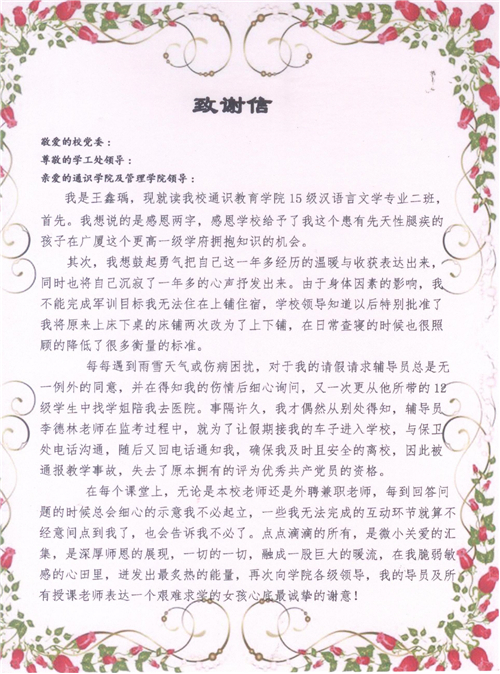 在每个课堂上,无论是本校老师还是外聘兼职老师,每到回答问题的时候总会细心的示意我不必起立,一些我无法完成的互动环节就算不经意间点到我了,也会告诉我不必了。点点滴滴的所有,是微小关爱的汇集,是深厚师恩的展现,一切的一切,融成一股巨大的暖流,在我脆弱敏感的心田里,迸发出最炙热的能量,再次向学院各级领导,我的导员及所有授课老师表达一个艰难求学的女孩心底最诚挚的谢意!