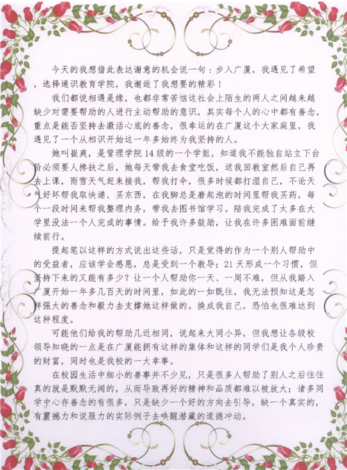 可能他们给我的帮助几近相同,说起来大同小异,但我想让校领导知晓的一点是在广厦能拥有这样的集体和这样的同学们是我个人珍贵的财富,同时也是我校的一大幸事。