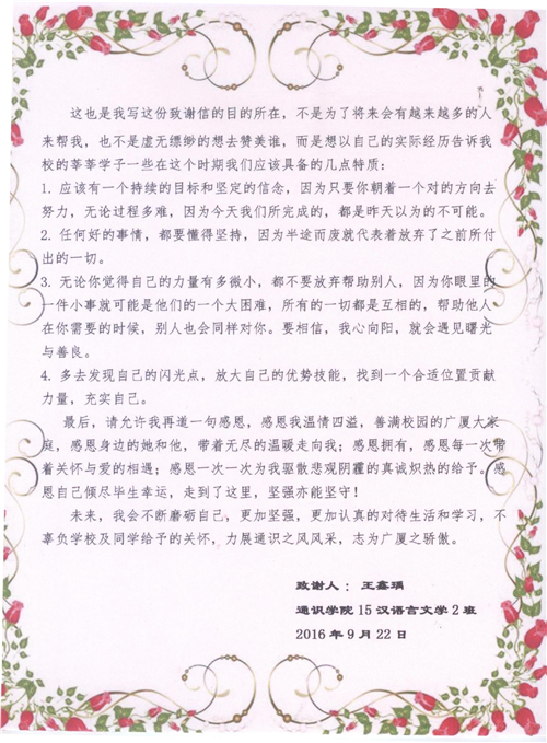 这也是我写这封致谢信的目的所在,不是为了将来会有越来越多的人来帮我,也不是虚无缥缈的想去赞美谁,而是想以自己的实际经历告诉我校的莘莘学子一些在这个时期我们应该具备的几点特质: