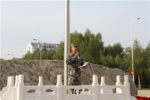 民兵连副连长宋成在国旗下庄严宣誓:“时刻铭记母校‘致知格物品端学粹’的校训和老师的教导,牢记当代大学生应有的社会责任感和历史使命感,做一个文明学生,为祖国的繁荣昌盛努力学习!”