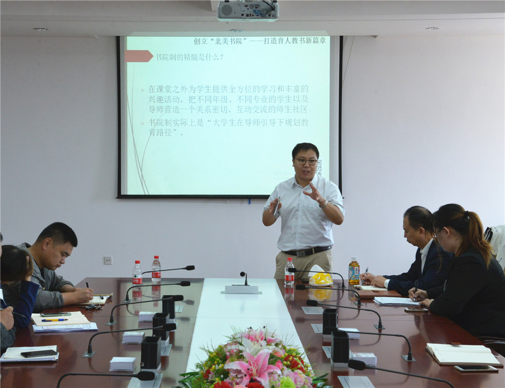 贾瑞老师以“创立北美书院—打造育人教书新篇章”为题,进行了图文并茂的演讲,他详细介绍了加拿大学期团的教学模式、培养目标、课程设置、日常管理及学员学习效果,并与大家分享了燕京理工学院的工作经验和方法,使大家对海外课堂项目有了更深层次的理解和认识,与会人员均表示受益匪浅。报告结束后,与会辅导员与贾老师展开了深入交流和探讨。